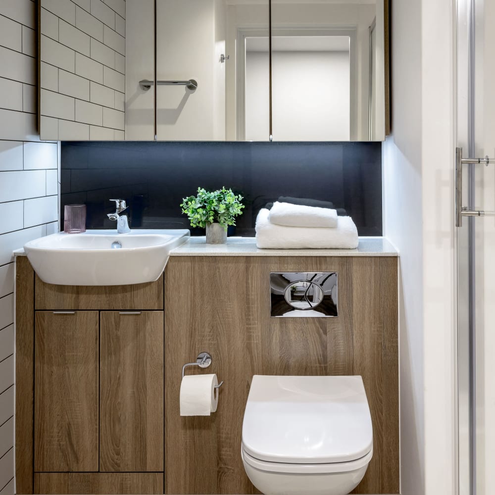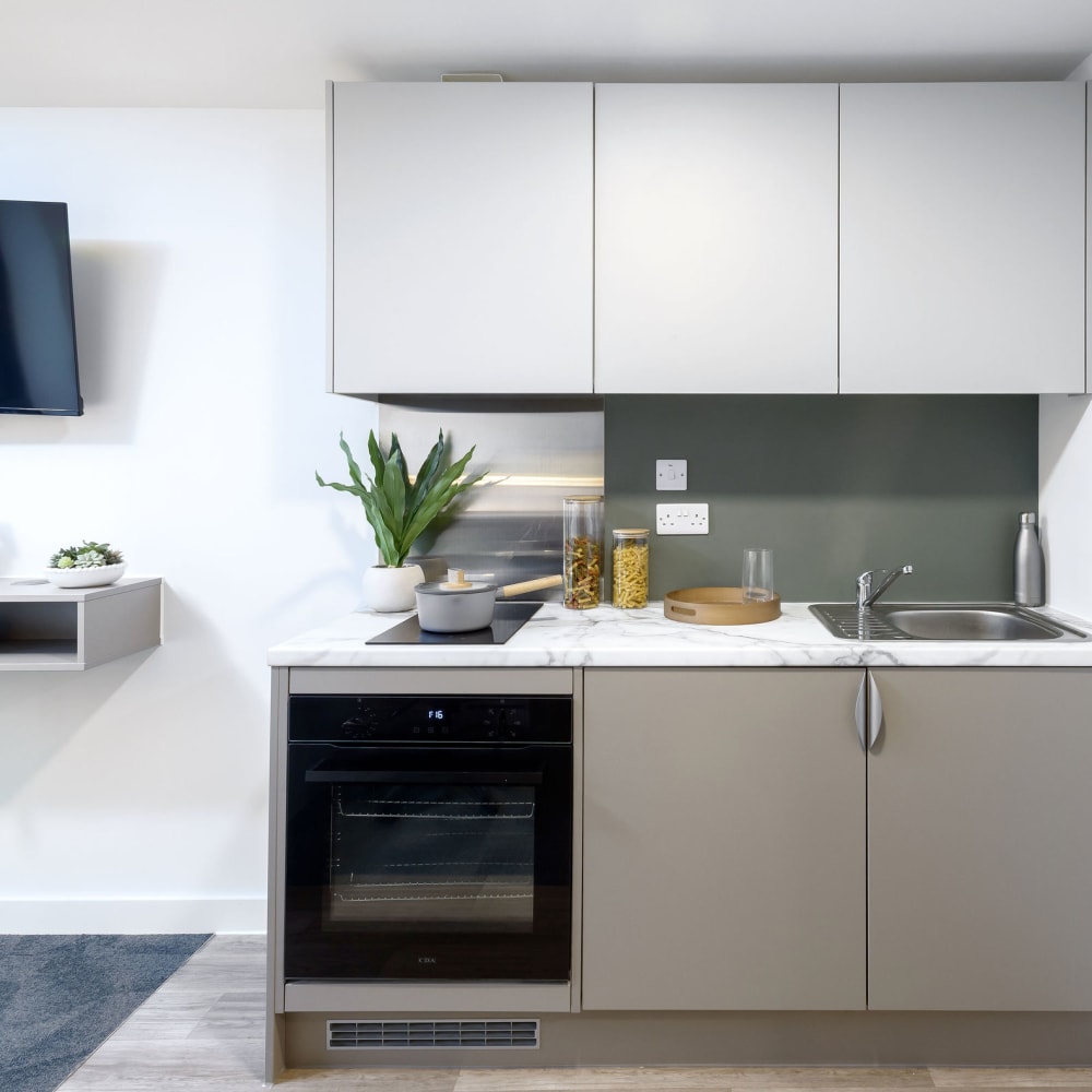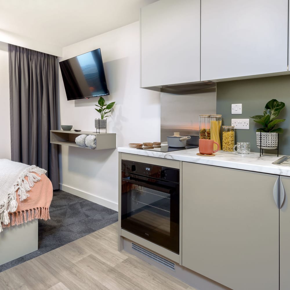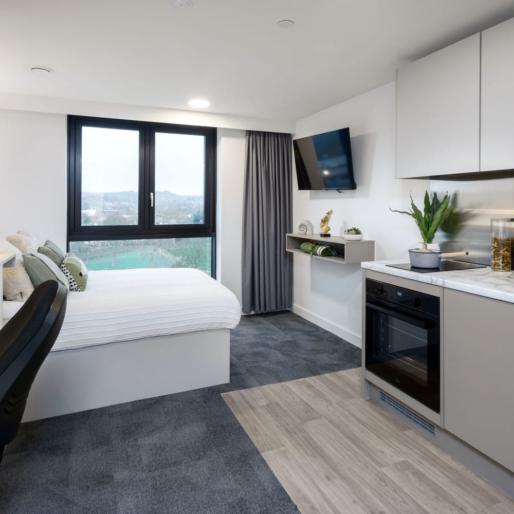 Located on our top floors, the Sky Studios in our Nottingham student accommodation are perfect for creating your home-away-from-home while at university. Sized at 18.8–19.3 sqm, these private studios offer everything you need for a comfortable and stylish student lifestyle.