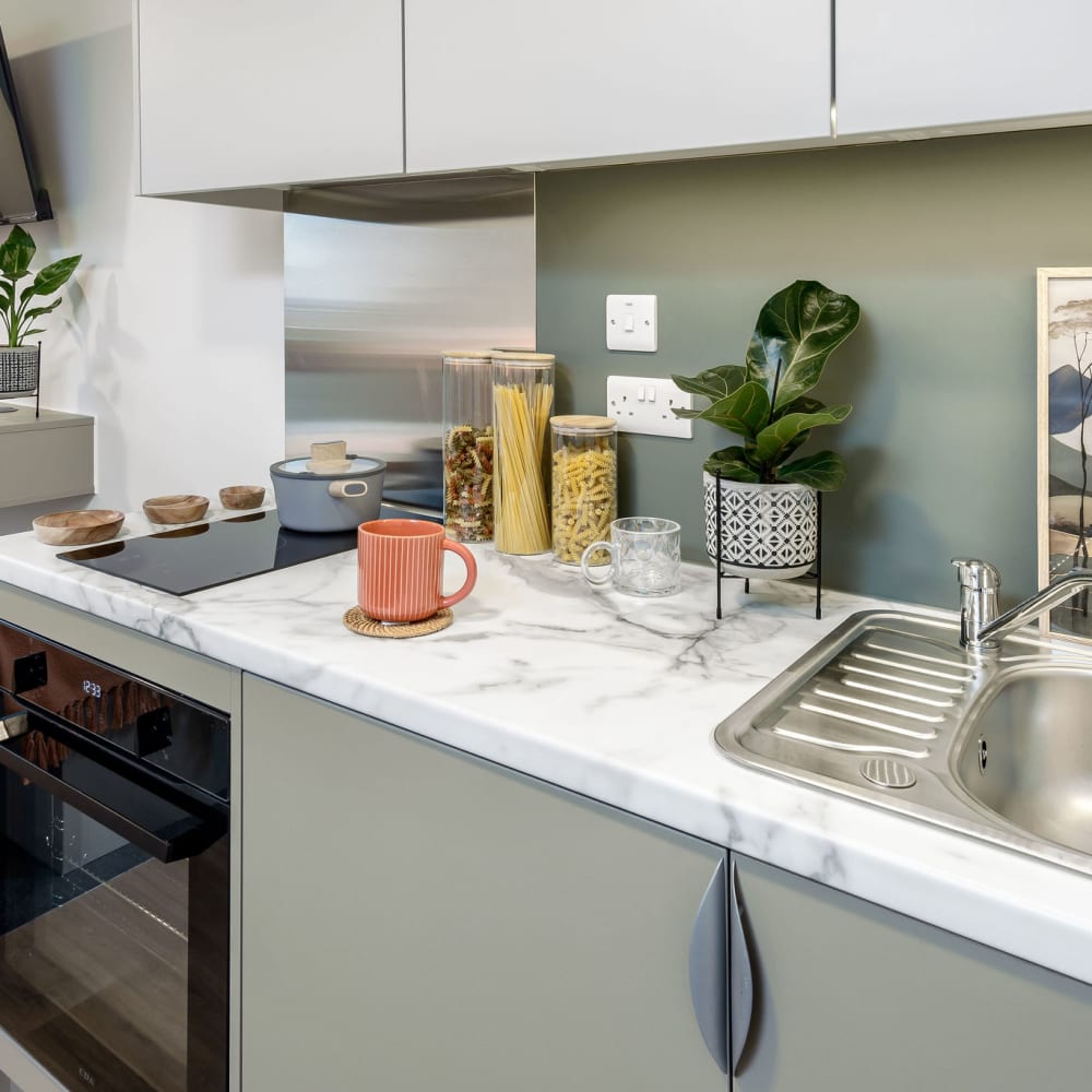 Inside your studio you’ll get a full-size double bed, a dedicated desk and chair for studying, and a wardrobe for storage. The private ensuite bathroom gives you your own space to relax and refresh. With a fully-fitted kitchenette, you have everything you need to cook, dine, and unwind in comfort.