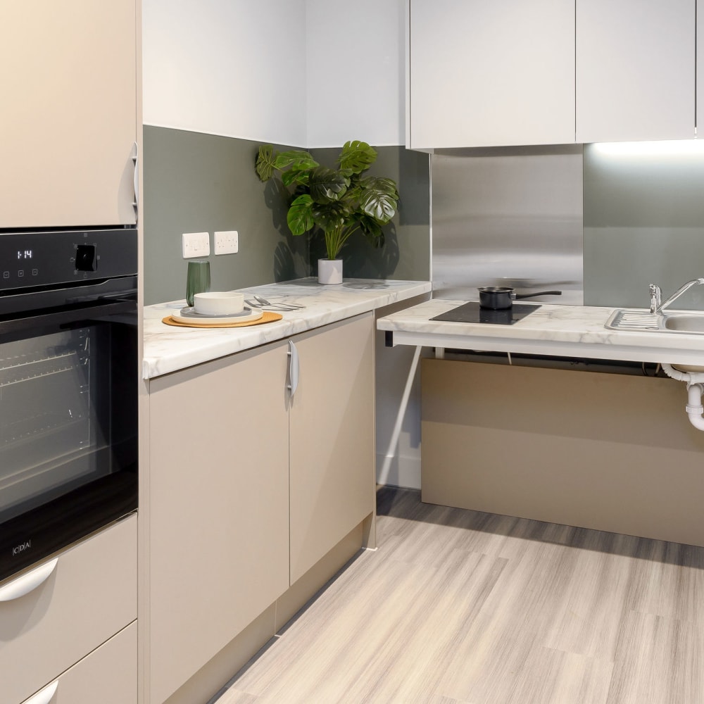These spacious student accommodation rooms are designed with accessibility in mind. Each room contains a bedroom, kitchenette and ensuite wet room, plus plenty of features for ease and comfort. With 2 large windows, these rooms are always full of wonderful natural light.