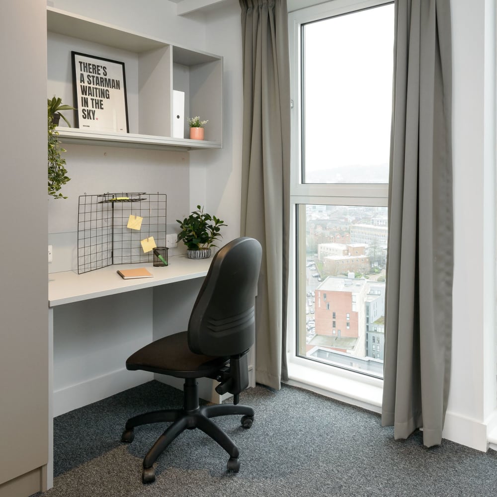 Located on floors 21-26, our private student accommodation in Sheffield is perfect for making a home-away-from-home when moving to university! These studio rooms come fully equipped with a double bed, desk area, en-suite bathroom, and your very own private, fully-fitted kitchenette. Please note, images are for representative purposes and actual rooms may differ in design and layout.